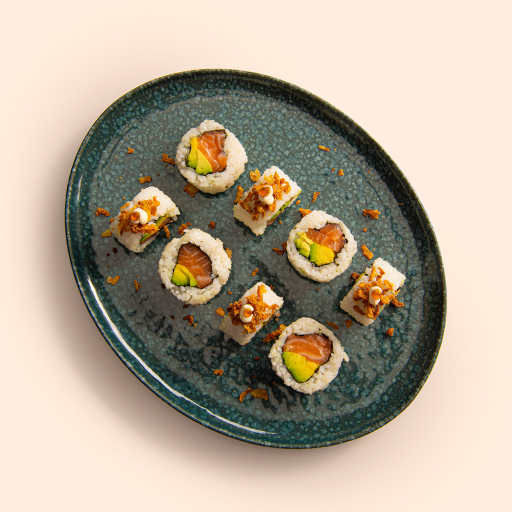 SALMÓN,AGUACATE,PEPINO,SALSA TERIYAKI,MAYONESA,CEBOLLA FRITA