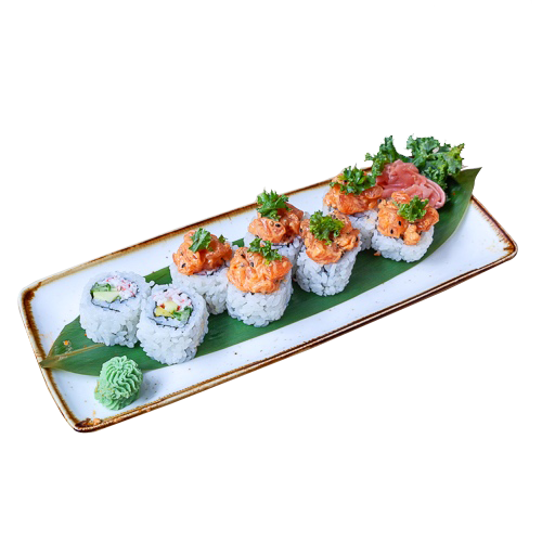 CANGREJO,MANGO,PEPINO,SPICY SALMÓN ,SALSA SPICY